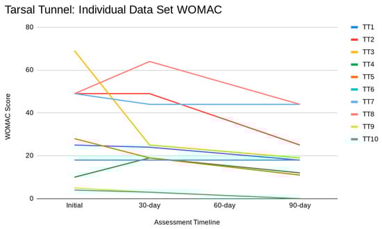 Figure 3 illustrates individual tarsal tunnel data sets for the WOMAC scale. It is essential to recognize that a higher WOMAC score correlates to increased pain.