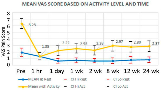 Figure 4 shows the mean VAS scores at rest and with activity over time, along with the standard deviation. Similarly, the Womac scores improved from baseline over time with a