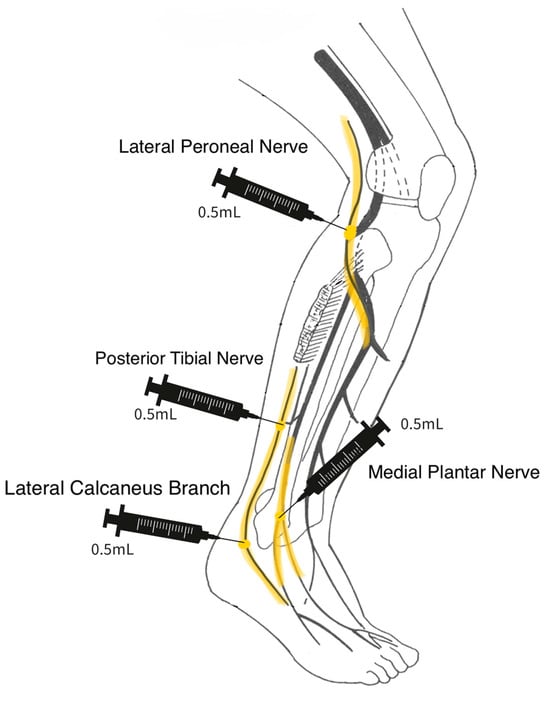 A 25-gauge needle was used in the application of the WJ tissue allograft. The application did not involve a guided entry. If sensory loss was present only in the foot, a total of 2 mL WJ was applied in 3 separate injection sites. The sites included 0.5 cc of WJ at the posterior tibial nerve, 0.5 cc at the medial plantar nerve, and 1 cc at the superficial peroneal nerve on the dorsal side of the foot. If the neuropathy extended upwards towards the patella, then a total of 2 mL WJ was applied in four different injection sites: 0.5 cc into the lateral calcaneus branch, 0.5 cc to the lateral peroneal nerve just below the patella, 0.5 cc to the medial plantar nerve, and 0.5 cc to the posterior tibial nerve (