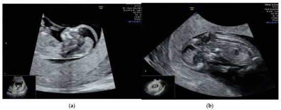 - Sepulveda, W.; Wong, A.E.; Andreeva, E.; Odegova, N.; Martinez-Ten, P.; Meagher, S. Sonographic spectrum of first-trimester fetal cephalocele: Review of 35 cases. Ultrasound Obstet. Gynecol. 2015, 46, 29–33. [Google Scholar] [CrossRef] [PubMed]