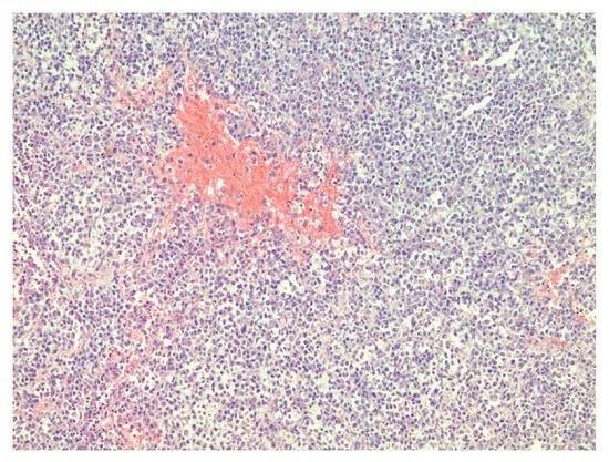Densely packed tumor cells and focal hemorrhages in tumor tissue, hematoxylin–eosin, original magnification ×100.