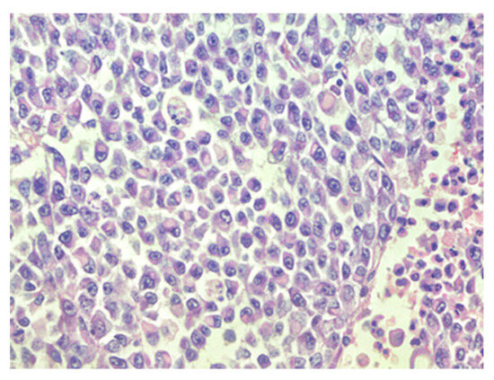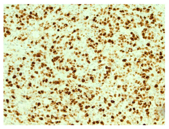 The patient was transferred to a neurosurgical facility, where a subsequent right-sided craniotomy with subtotal resection was performed. Total resection was not feasible as the tumor infiltrated the M1 segment of the right middle cerebral artery (MCA). Subsequently, the patient’s condition showed a dynamic improvement, and she started to move her left arm and leg more. The histological picture was consistent with the histology of the classic rhabdoid tumor: a small, round-shaped cell with an eccentrically placed nuclear, dense chromatin pattern, and bright eosinophilic cytoplasm. Immunohistochemical analysis showed retained nuclear expression of INI1, which is not a typical AT/RT finding. The proliferative marker Ki67 reached 90% at a higher concentration of positive cells, suggesting aggressive progression of tumor growth. The antibodies used for immunohistochemistry were sourced from respected suppliers and underwent extensive validation procedures to ensure reliability and specificity. Specifically, INI1 and BRG1 antibodies were obtained from Santa Cruz Biotechnology Company, while antibodies targeting EMA (epithelial membrane antigen), SYN (synaptophysin), GFAP (glial fibrillary acidic protein), S-100 and Ki67 were sourced from Dako Corporation. Additionally, the IDH1 (isocitrate dehydrogenase 1) antibody was obtained from Dianova. The pathological and immunohistochemical analysis of the patient’s surgical specimen is shown in Figure 1, Figure 2, Figure 3, Figure 4, Figure 5 and Figure 6.