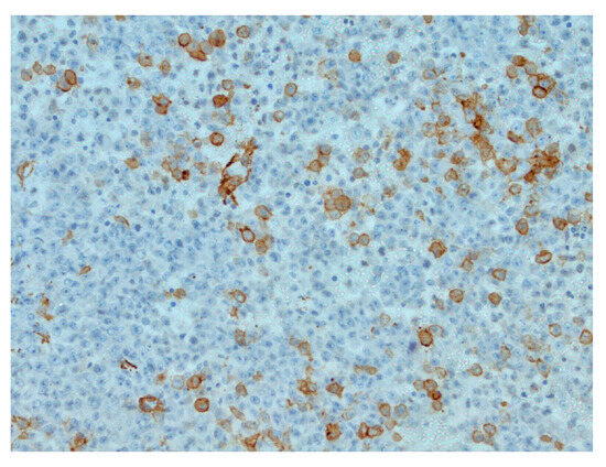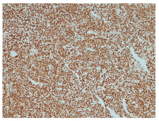 Ordinarily, AT/RT is associated with biallelic inactivation of the SMARCB1 (SWI/SNF-related matrix-associated actin-dependent regulator of the chromatin subfamily B member 1) gene at position 22q11.2. [4,5]. AT/RT can be broken down into three different molecular groups: AT/RT-SHH, AT/RT-TYR, and AT/RT-MYC. In general, these groups differ from each other in age at the time of diagnosis, location in the brain, epigenetic profile, and prognosis [1,2,3,5,6]. The SMARCB1 gene encodes the integrase interactor 1 INI1 protein, being a core member of the adenosine triphosphate-dependent SWI/SNF (SWItch/sucrose non-fermentable) chromatin remodeling complex, which possesses a wide-ranging function in activating genes by remodeling nucleosomes and facilitating the accessibility of transcription factors to their respective recognition sites, thus acting as a key regulator of cell proliferation and cell lineage determination [3,7]. In rare cases, mutations are observed in the SMARCA4 gene, which encodes another member of the SWI/SNF chromatin remodeling complex—named Brahma-related gene 1 (BRG1)—that facilitates transcriptional activation or repression of target genes and acts as a tumor suppressor through chromatin remodeling [8]. In these cases, INI1 expression is typically preserved and does not rule out a diagnosis of AT/RT; thus, it is necessary to determine BRG1 nuclear expression [1,4].