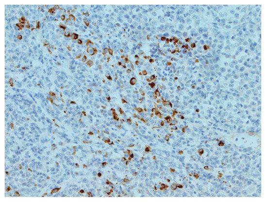 Focal CKAE1/AE3 positivity in tumor cells, IHC, original magnification ×200.