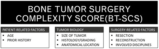 Drawing from the literature and insights from seasoned sarcoma surgeons, we formulated the Bone Tumor Surgery Complexity Score (BT-SCS). This score was developed in a manner analogous to that of the Soft Tissue Sarcoma Surgery Complexity Score, which we previously delineated [12]. The BT-SCS is based on insights from the literature and experienced surgeons. It is fundamentally structured around three core domains—patient characteristics, tumor biology, and surgical parameters (Figure 1). The considerations that led to the content of the score are outlined below.