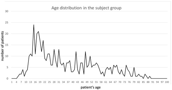 In this study, we investigated the surgeries of 501 patients with both benign and malignant diagnoses. In this patient population, the average age was 36.0 ± 20.1 years; the youngest patient was 5 years old and the oldest patient was 89. The expected first frequency peak of bone tumor diagnoses in adolescence and young adulthood is evident. The second peak found in the literature, which is supposed to occur in older adulthood, is not explicitly reflected in our data (Figure 2). Of the patients studied, 285 were male, representing a proportion of 57%, and 216 were female (43%). The male-to-female ratio was 1.32. Most patients operated on during this study had malignant tumors (180 patients, 36%), 148 had benign tumors (30%), and 107 had tumors with intermediate malignancy (21%). In total, 43 patients (9%) had metastases from other primary tumors. A minority suffered from tumor simulators (tumors which may imply a sarcoma on imaging, but are later revealed to be a benign lesion) and hematologic tumors of bone (incl. myeloma and lymphoma).