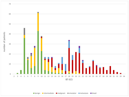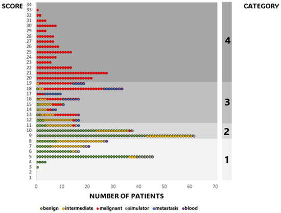 Category 1 consisted of patients scoring below 9 points, representing a wide range of scores and comprising 117 patients (23.4% of the total). Within this category, patients had diverse diagnoses, including benign and intermediate tumors, as well as tumor simulators. Category 2 encompassed patients with scores ranging from 9 to 11 points, which was a relatively narrow range, but still accounted for 117 patients (23.4%). The majority of patients falling in this range had benign or intermediate diagnoses, but a few had malignant diagnoses. Patients with scores between 12 and 19 points were placed in Category 3, which included 133 patients (26.5%). Finally, Category 4, the highest category, included 134 patients (26.7%), exclusively including patients with malignant diagnoses (refer to Figure 5).