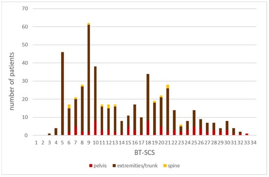 Figure 4. Distribution of the totals of the Bone Tumor Surgery Complexity Score (BT-SCS) in the sampling group, with respect to tumor localization.