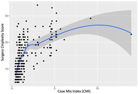 Figure 6. Comparison between Case Mix Index (CMI) and surgical complexity scores using Loess smoothing.