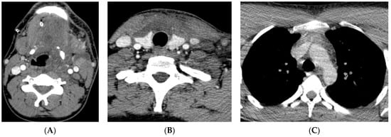 (Patient 1) Axial contrast-enhanced CT image; (A) abscess/hypodense lesions/in the left submandibular, parapharyngeal, pharyngeal mucosal and retropharyngeal spaces. (B) Mediastinitis in the visceral space. (C) Upper anterior mediastinum—mediastinitis.