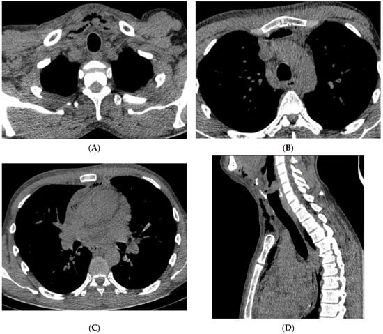 - Benedetto, C.; Tanzariello, V.N.; Militi, A.; Fallica, G.E.; Di Marco, D.; Monaco, F.; Ugo, B. Catastrophic descending necrotizing mediastinitis of the anterior and posterior compartments: A case report. Radiol. Case Rep. 2020, 15, 1832–1836. [Google Scholar] [CrossRef] [PubMed]