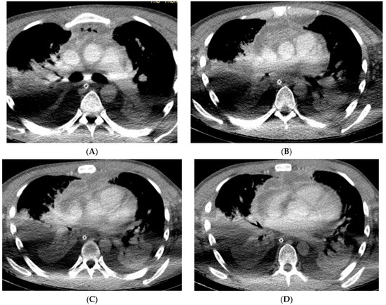 (Patient 4) Axial contrast-enhanced CT image; (A–D) mediastinal empyema on the anterior mediastinum and retrosternal space and bilateral pleural effusions.