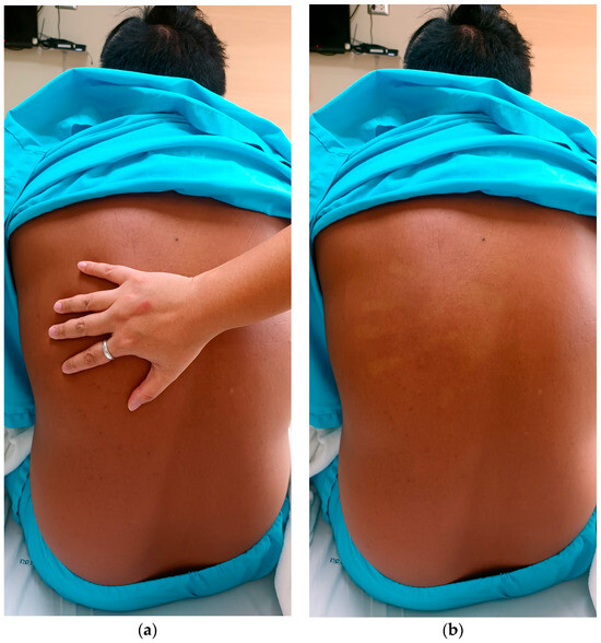 Febrile rash in dengue. (a) Demonstrating maneuver to exhibit blanching of acute erythematous rash in dengue. This technique exhibits the blanching effect on an acute erythematous rash in dengue. When gentle pressure is applied, the redness temporarily fades, indicating the rash’s responsiveness to pressure. (b) Confluent erythema covering entire back area; the distinctive feature is the clear demarcation observed on the palm of the co-author’s hand when gently pressed against the erythematous skin surface. The blanching effect observed is believed to arise from the dilation of the capillaries, a consequence of the interplay between the virus and the host response during a dengue infection.