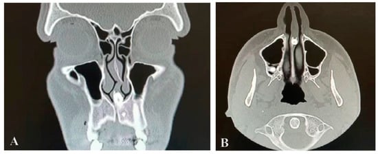 A cone-beam CT scan of the paranasal sinuses was performed, with the examination revealing nasal septum deviation, hypertrophia of both nasal turbinates, clear paranasal sinus, and the presence of a radiopaque lesion near the nasal septum with an attenuation of the mass that was the same as that of the oral teeth. It was localized in the maxillary midline area, it was set in the nasal septum and caused significant displacement of it. It was not detected during the clinical assessment because it was embedded in the nasal mucosa. A CT axial view of the intranasal mesiodens revealed its penetration into the nasal cavity, specifically located in the nasal septum. A coronal scan obtained with the bone window setting shows the crown portion of the impacted mesiodens within the base of the nasal septum (Figure 1A,B).