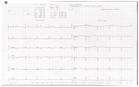 A 36-year-old male with first grade essential arterial hypertension with good medical control was referred for routine cardiovascular exam. He had a medical history of heart murmur since childhood and has been told to have interventricular communication. No prior medical records were submitted. Physical examination did not demonstrate any cardio-pulmonary abnormalities. An electrocardiogram (ECG) revealed sinus rhythm at 62 bpm, normal axis, poor R-wave progression in the precordial leads and repolarization abnormalities and negative T waves in V1–V4 (Figure 1).