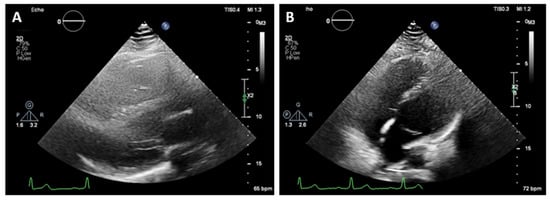 Two-dimensional transthoracic echocardiography. (A)—Parasternal long axis view gave the impression of right ventricular dilatation. Hyperechogenic space behind left ventricular posterior wall. Poor image quality. (B)—It was impossible to visualize the apex of the heart from the standard apical views in left lateral position.