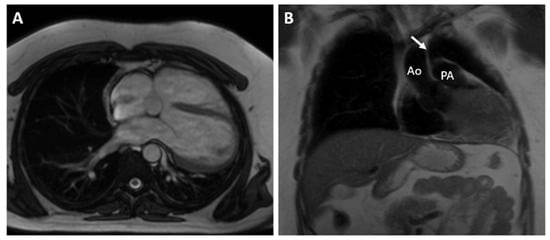 (A)—Axial image of the chest shows the displacement of the heart into the left hemithorax with the cardiac apex pointing laterally and posteriorly. (B)—Coronal image of the chest demonstrates the interposition of lung tissue between the aorta and pulmonary artery (white arrow). Ao—aorta; PA—pulmonary artery.