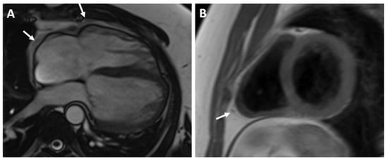 SSFP CINE image in four chamber view (A) and T1-weighted fast spin-echo in axial view (B) demonstrate discontinuous segments of pericardium surrounding the right atrium and right ventricular lateral wall. No detectable pericardium was found around the left ventricular wall.