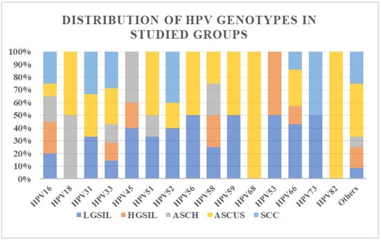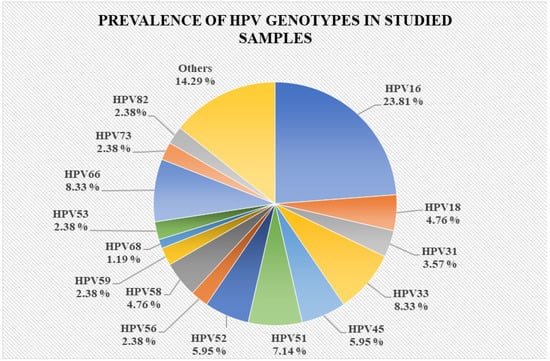 Furthermore, we observed that HPV16 had the highest prevalence, accounting for 23.81% of the total investigated samples. Prevalence data are shown in Figure 2.