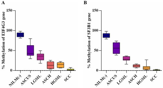 For the SF3B1 promoter, the lowest methylation values were found in SCC samples (0–3.08%), followed by slight increases in the HGSIL (range: 38.61–73.89%) and ASCH (6.43–16.50%) groups. Higher percentages were observed in the LGSIL (15.97–36.60%) and ASCUS (38.61–73.89%) lesions.