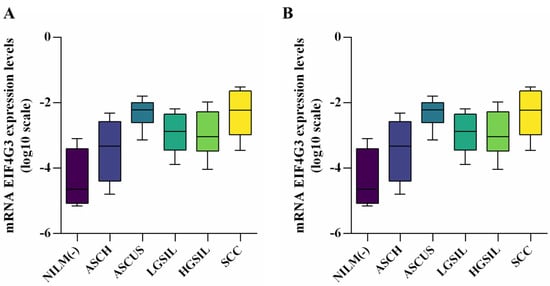 Therefore, we intended to evaluate further and validate the prospective prognostic potential of two significant genes, EIF4G3 and SF3B1, that we previously identified with increased mRNA expression levels in precursor lesions through lavage sample testing these markers in a cohort study (new patients) and determine the risk of progression of low- and high-grade CIN lesions [10].
