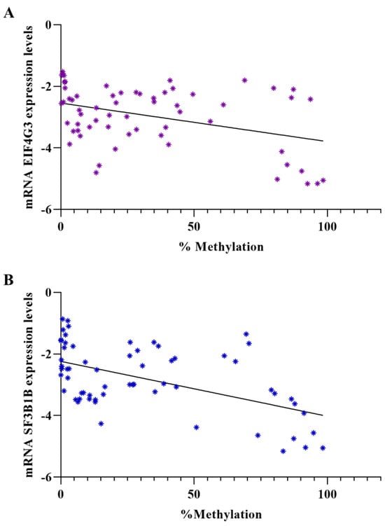 Further, we investigated the correlation between mRNA expression levels and methylation status for both genes and observed a significant inverse correlation. For EIF4G3, the correlation had a p-value of 0.0016 (Y = −0.01252X − 2.543), and for SF3B1, the p-value was less than 0.0001 (Y = −0.01782X − 2.240) (Figure 5).
