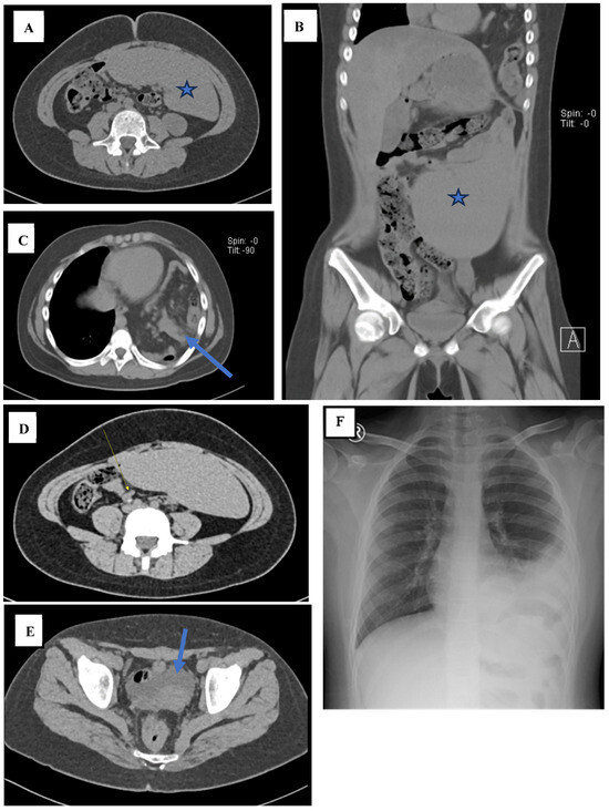 ((A) axial; (B) coronal). The abdominal CT shows that the spleen was located at the mid-lower anterior abdomen, measuring ±14.3 × 18.6 × 5 cm (denoted by the star). (C) The components of the mesentery and intestines (arrow) are visible entering the left thoracic cavity through a defect in the left diaphragm measuring approximately 3.2 cm. (D) There is a tubular blind structure approximately 6.8 mm in diameter (arrow) with a hyperdense lesion inside measuring approximately 4.4 mm in diameter, extending approximately 57.7 mm in the lower right abdominal region. (E) Ascites is present in the pelvic region (arrow). (F) The pre-operative chest X-ray shows opacity in the basal left hemithorax and left paracardial region with opacification of the left diaphragm and a left costophrenic sinus.