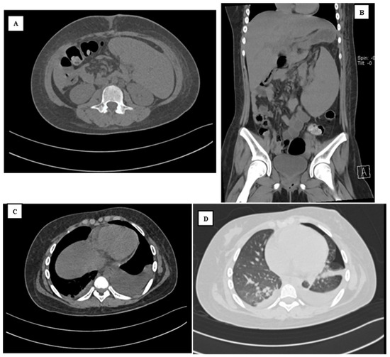 ((A) axial; (B) coronal). The abdominal CT shows that the spleen was located at the mid-lower anterior abdomen, measuring ±14 × 16.7 × 7 cm, which is relatively similar compared to the last CT scan. (C) There is bilateral pleural effusion, which was more severe on the left and (D) the lung window shows the presence of left pneumothorax.