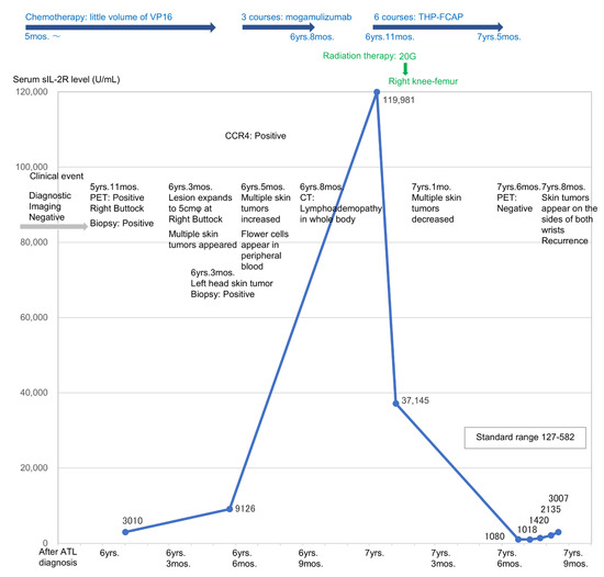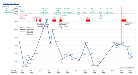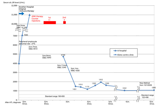Figure 3. Fluctuation of serum sIL-2R levels in Patient 1 with ANK therapy after acute exacerbation of smoldering ATL. Reprinted/adapted with permission from Ref. [13]. Copyright 2018, copyright Dr. Keisuke Teshigawara.