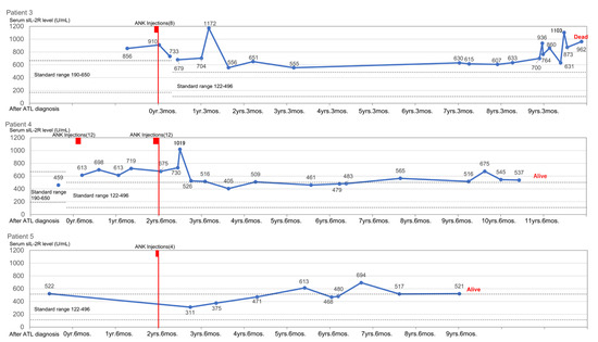 For Patient 1, at the time of exacerbation, serum sIL-2R levels increased to 11,000 U/mL, but after two courses of ANK therapy (11 and 4 doses), the levels decreased to less than 2000 U/mL, resulting in CR. Thereafter, she did not need any supportive therapy and maintained CR for 5 years and 6 months after the start of ANK therapy until she died of myocardial infarction (Figure 3).