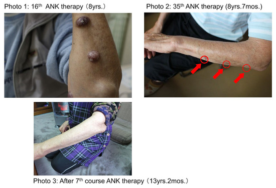 Since Patient 2 had already received multi-agent chemotherapy, she underwent repeated single-agent chemotherapy and radiation on the skin tumors. Radiation on the skin tumors, except those on the left forearm, was performed. ANK therapy was applied between each course of radiation. Radiation and ANK therapy decreased serum sIL-2R levels to 2655 U/mL after the fifth course (Figure 5). ANK therapy was able to eliminate multiple skin tumors on the left forearm, even though no radiation was delivered there (Figure 6, red arrows; Photo 2).