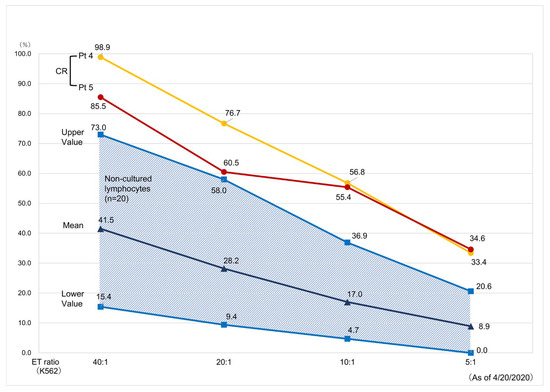 To avoid cytokine release syndrome, the dose of the ANK cells used was limited, but some patients experienced a temporary high fever, which improved by the next day and returned to healthy levels. In four patients who received ANK therapy (Patients 1, 3, 4, and 5), their CR status was maintained for more than 5 years, suggesting that ANK therapy enhanced their host immune function. NK cell activity in two CR patients (Patients 4 and 5) who survived for more than 7 years after ANK therapy was assayed using europium-labeled K562 cells as a target [14]. Interestingly, these patients showed higher NK cell activity compared with healthy controls (Figure 7).