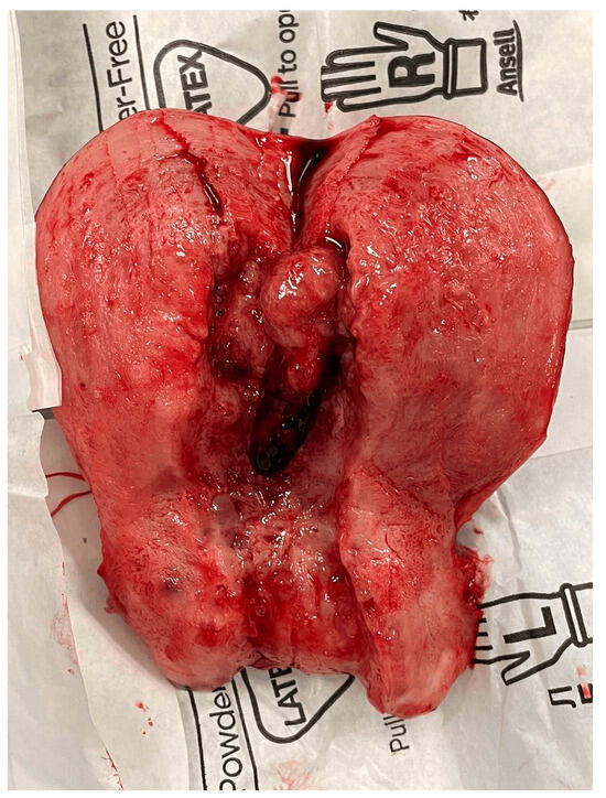 The patient was a 67-year-old woman, gravida 2, para 2. She was urgently hospitalised on 10 February 2023 at the Obstetrics and Gynaecology Clinic of St. George University Hospital in Plovdiv, Bulgaria. Her complaints were of abnormal uterine bleeding with varying intensity for the past 7 days. She had been in menopause for 30 years without taking hormone replacement therapy. She had the following comorbidities: essential arterial hypertension and obesity, without a history of exposure to harmful factors in a professional environment or in her personal lifestyle.