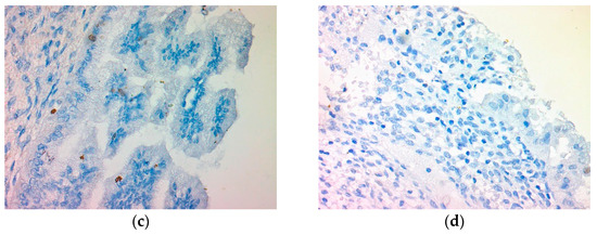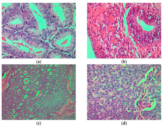 Histopathological examination, conducted by staining the paraffin preparations with haematoxylin–eosin, confirmed atypical hyperplasia of the surrounding endometrium and a malignant endometrial polyp. The results are shown in Figure 2a–d.