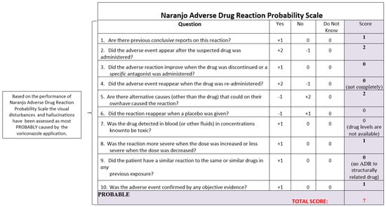 The clinical pharmacist gathered comprehensive anamnestic information through a detailed patient interview. A comprehensive assessment of potential drug interactions, including the prescription history from the past few weeks, was conducted. This assessment specifically looked for drug–drug interactions, drug–food interactions, and any delayed side effects of medications other than voriconazole. The Naranjo algorithm was used to evaluate the causal relationship between the observed hallucinations of crocus blossoms as well as the visual disturbances of a purple color, and the infusion of voriconazole (
