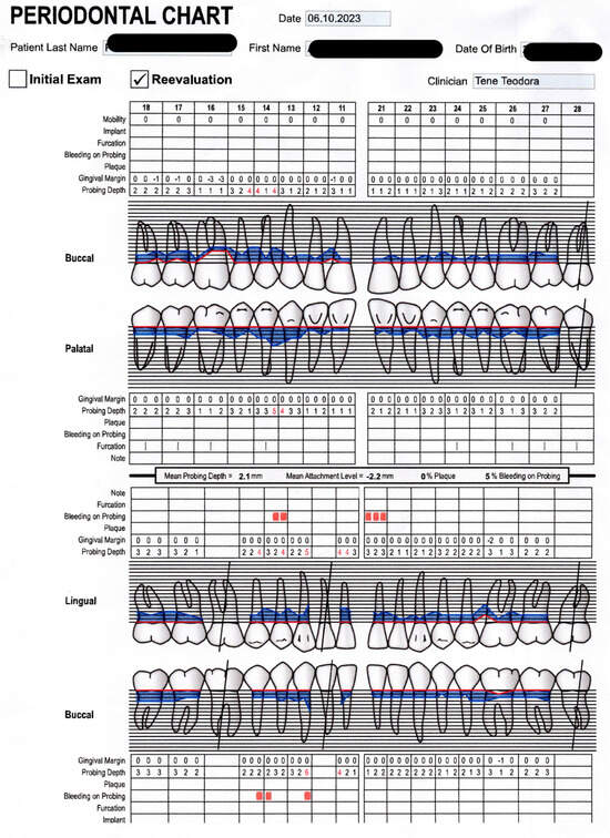 The periodontal chart showed an improvement in the periodontal status of the patient: the main probing depth was 2.1 mm, bleeding on probing was reduced, as well, and the clinical attachment loss had decreased, which is the best sign of healthier periodontal tissue. The therapy showed its benefits both in the PD markers and in reducing tooth sensitivity.