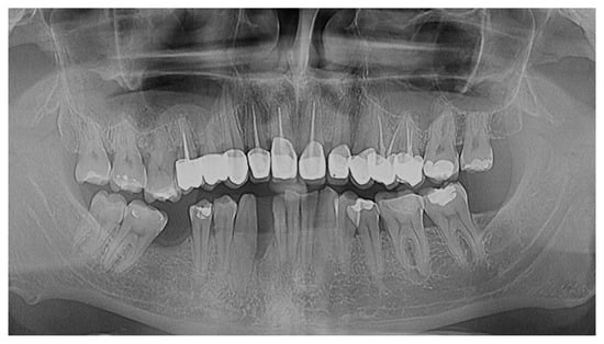 Radiological examination (Figure 1) was performed prior to treatment using digital imaging, obtaining a panoramic image, 0.025 mSv, which provided a clear assessment of the extent of bone resorption and the depth of periodontal pockets and the shape and height of the alveolar crest and furcation defects. The type of bone loss (horizontal or vertical) is a very important aspect that might indicate the appropriate treatment approach [11]. These images served as both a diagnostic tool and a baseline for comparison during follow-up evaluations (Figure 2).