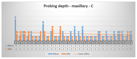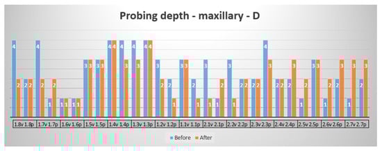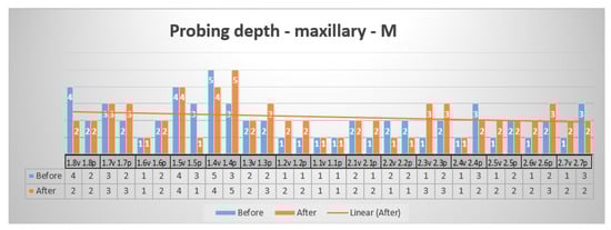 The three values greater than the physiological ones in the initial exam—the vestibular surface and the mesial surfaces of the superior teeth presented in Figure 7—were reduced after periodontal treatment. The physiological values (1–3 mm probing depth) did not present significant change. One dental site presented a slight increase (from 3 mm to 5 mm).