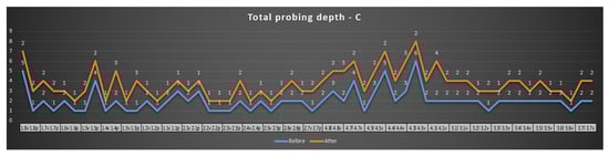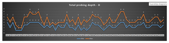 In Figure 10, an improvement in the periodontal status on the mesial surface can be observed. This improvement is not as obvious as it is on the other surfaces examined. The depth of the periodontal pockets is reduced, but it is also observed that a number of them continue to be within the pathological value range (over 4 mm).