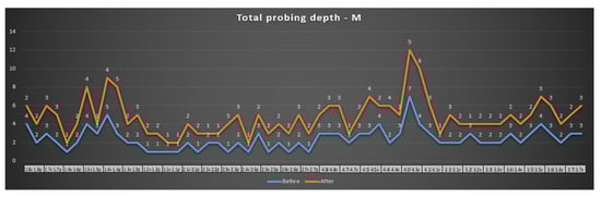 In Figure 8, a tendency of stabilization of periodontal pockets can be observed. The number of periodontal pockets with pathological values was significantly reduced after the SRP and laser treatment. Out of the 11 sites with pathological values, 7 improved after treatment (63% of the pathological sites presented physiological values), which means more than half of them presented improvements.