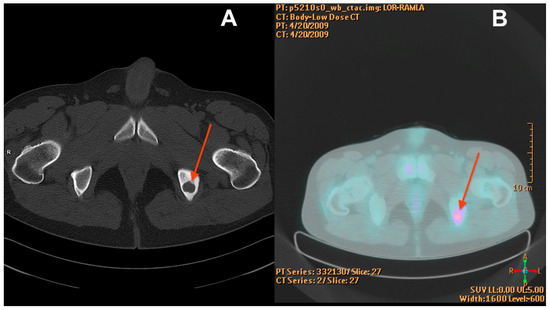 CT scan from 2009 (A) showing a well-demarcated osteolytic lesion in the left ischium (red arrow). The mean density of the tumour in the pre-contrast scan was 87 Hounsfield units (HU) and showed moderate enhancement in the subsequent phases reaching 112 HU in the venous phase. PET-CT from 2009 (B) with increased radiotracer uptake at the tumour location (red arrow).