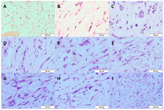 Haematoxylin and eosin (HE) staining (magnification is shown for each picture). (A) Intertrabecular space (a bone trabeculae visible in the lower left corner) filled with malignant mesenchymal neoplastic cells with myxomatous lining. Epithelioid, polymorphic tumour cells. (B) Epithelioid and spindle-shaped tumour cells. (C) Cluster of epithelioid cells. (D) Spindle-shaped tumour cells with intracytoplasmic inclusions. (E) Tumour cells with intracytoplasmic inclusions. (F) Cluster of tumour cells. Erythrocytes are visible in the cytoplasm of one tumour cell (central part of the photo). (G) Cluster of tumour cells. In a single cell, intranuclear inclusion and an eosinophil are visible. (H) Cluster of tumour cells. A lymphocyte visible in the cytoplasm of a single cell. (I) The interbone space filled with malignant mesenchymal neoplasm with myxomatous lining. Polymorphic epithelioid tumour cells.