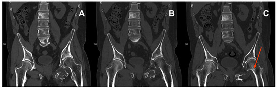 CT scans from September 2022 (A), January 2023 (B), and April 2023 showing decreased bone density in the left femur and pathological lesions in the vertebrae and left pelvic bones. Early signs of a subcapital fracture of the left femoral neck (red arrow) first seen in the CT from April 2023 (C).
