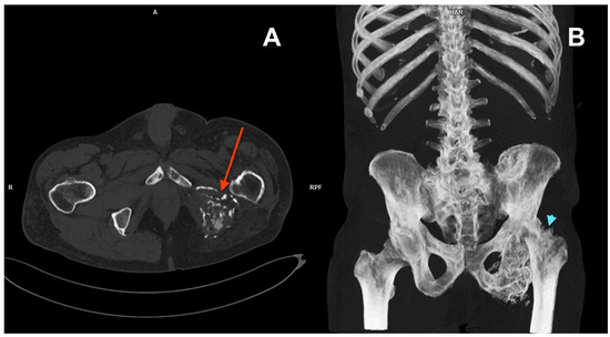 CT scan from August 2023 (A) showing extensive lytic infiltration of the left ischium at the initial tumour site (red arrow). Coronal plane maximum intensity projection (MIP) of the same CT (B). Impacted fracture of the left femoral neck (blue arrowhead) caused by the neoplastic infiltration. Pathological lesions in the left ischium and hip bone as well as in ribs 10 and 11 on the right side.