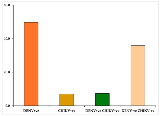 The overlap in clinical symptoms between chikungunya and dengue infections poses a significant challenge for differential diagnosis on the basis of clinical findings at presentation alone. The higher prevalence of arthralgia in chikungunya (44.4%) and coinfected patients (42.9%) than in dengue patients (32.6%) aligns with the characteristic joint pain associated with acute chikungunya infection. This finding highlights the importance of considering chikungunya in patients who present with acute febrile illness with prominent joint pain, especially with articular tenderness and peripheral joint involvement. Arthralgia can present with other viruses described above. For example, rubella infection in adults can involve polyarthralgia of large joints, and similar clinical manifestations or arthropathy have also been reported in adults with parvovirus B19 [18,19].