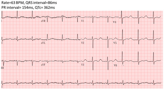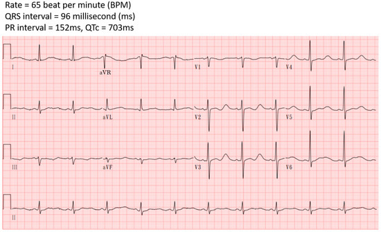 The patient’s condition stabilized, with no further QT interval prolongation or ventricular premature complexes observed with a follow-up ECG after treatment (Figure 4). He was transferred to a general ward on the 4th day and discharged on the 6th day after admission without any complications. He received oral potassium gluconate at 20 mEq four times daily for five days following discharge.