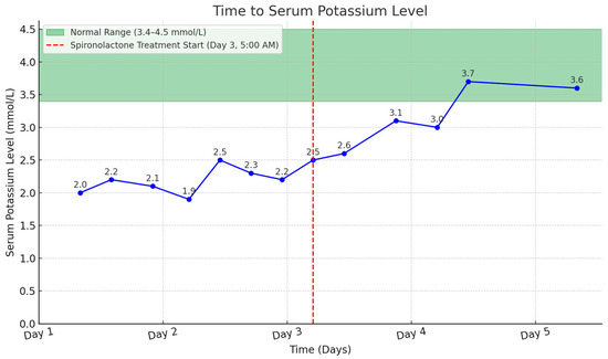 The patient was treated with oral potassium gluconate, receiving 20 mEq four times daily, and intravenous potassium chloride at a dose of 20 mEq in 500 mL of 0.9% normal saline. Additionally, he received an intravenous supplement of 40 mEq potassium chloride in 110 mL of water every six hours. Despite treatment, his hypokalemia did not improve. In response to the persistent hypokalemia, he received spironolactone, an aldosterone receptor antagonist, at a dosage of 25 mg three times daily, beginning on the 3rd day after admission. The introduction of spironolactone, alongside potassium supplements, quickly normalized the patient’s hypokalemia (Figure 3). Furthermore, his metabolic alkalosis and rhabdomyolysis also improved with supportive care.