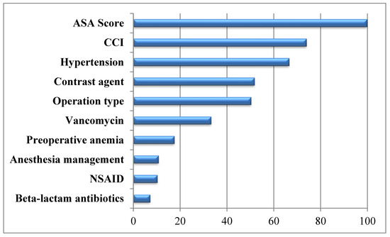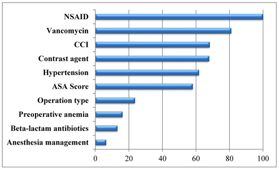 The significance of variables and the effect of these variables on AKI development were evaluated by using the information gain variable significance test in Figure 2. When evaluated according to the variable significance test result and clinical significance, the model consists of variables such as ASA, CCI, hypertension, nonsteroidal anti-inflammatory drugs (NSAIDs), vancomycin, beta lactam, contrast material, preoperative anemia, operation type, and anesthesia management.