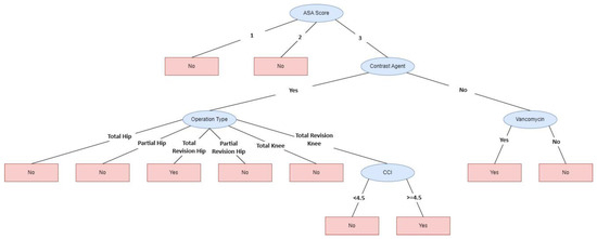 When the two methods were evaluated, 11 variables (10 independent and 1 dependent variable) were included in the study, and machine learning analysis was performed by using these variables (Figure 3). According to Figure 3, AKI risk increased in patients with ASA score III, using contrast material and undergoing total revision knee arthroplasty and total revision hip arthroplasty with a Charlson Comorbidity Index score ≥ 4.5. AKI risk increased in patients with an ASA score III not using contrast material but using vancomycin.