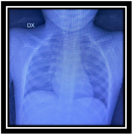 A 2-year-old child with a history of COVID-19 infection six months ago presented to the pediatric outpatient clinic with recurrent fever, submandibular lymphadenopathy, and a skin rash. Laboratory findings revealed the presence of microcytic anemia with an increase in c-reactive protein. At pediatric admission, a throat swab was performed, and blood agar, MacConkey agar (MCK), Sabouraud and Columbia Nalidixic Acid (CNA) plates were used. It is left to incubate for 24–48 h at 37 °C except for CNA, which is preserved in CO2. In the first 24 h, numerous yellow colonies were highlighted on the blood agar and MCK plates, which were identified with the MALDI-TOF MS system as C. gleum. A further throat swab and sputum examination were requested. The bacterium grew on both samples in the first 24 h and was again identified with the mass spectrometry identification system. An ultrasound of the neck and abdomen, in conjunction with a hematological evaluation, led to the diagnosis of submandibular lymphadenomegaly and anisopoikilocytosis. Additionally, the dermatologist diagnosed atopic dermatitis and prescribed topical treatment comprising a glucocorticoid (hydrocortisone 17-butyrate) and acetaminophen. At the follow-up, one month later, due to the persistence of symptoms, he was hospitalized in the pediatric division. A dermatological evaluation follow-up confirmed the presence of atopic skin disease, while an otorhinolaryngology consultation diagnosed tonsillar hypertrophy without ongoing inflammation. During the hospitalization, laboratory tests, bone marrow fine needle aspiration, and a new neck and abdomen ultrasound failed to reveal a systemic disease. In detail, chest X-ray reported mild accentuation of the bronchial structure, especially on the right side and in the middle–lower zone. Free costophrenic sinuses, cardiac shadow within the limits of a regular aorta, several oval lymph nodes with thick and hypoechoic and thin cortex, and hyperechoic central hilum in place, as shown in Figure 1.